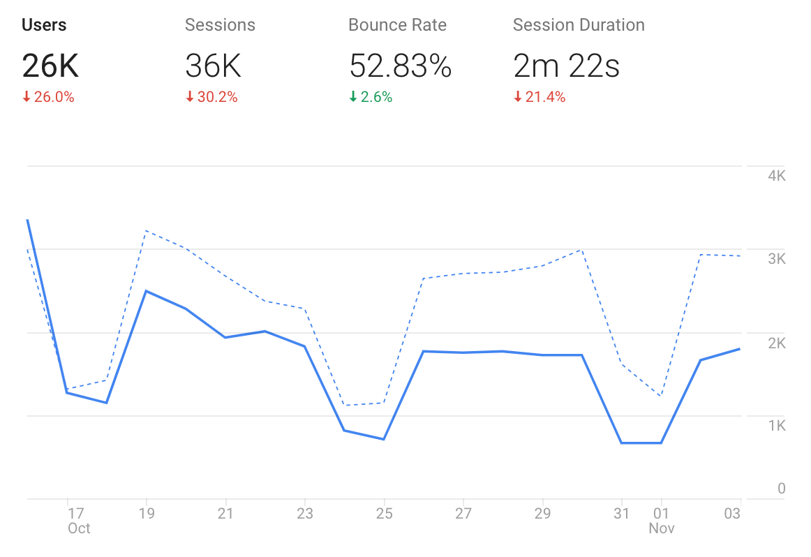 Traffic has dropped from ~15,000 users & ~82,000 page views per week to ~8,000 users and ~38,000 page views per week.